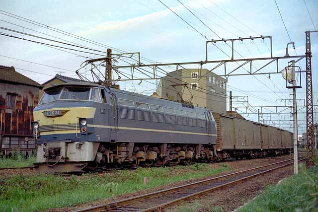 ▼ EF66 34 牽引、ワキ50000系+コキ50000系の1060レ。 80年 木曽川 - 岐阜