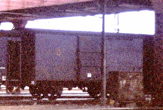 相互リンク先の’いちの休憩所’を主宰されているいち氏から提供いただきました。 オリジナル画像をトリミング縮小のうえ画質調整をいたしました。ご了承ください。 何とか「名」の所属標記を目立つように引き出してみましたが、番号標記は浮き出てきません。 ポム1形式は、ワム90000形式の内側に陶器を積み込むのに都合がいいように棚を設けただけのため、 外観上の差は標記類しかありません。 地区特性から、いち氏自身も、「ポムと推定できる」という申告のみでした。