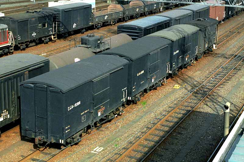 手前側がワム136221,中央はワム90450。奥側のワム90000は屋根の色が異なる。