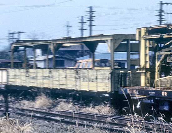 相互リンク先の’いちの休憩所’を主宰されているいち氏から提供いただきました。 オリジナル画像をトリミング・縮小のうえ画質調整をいたしました。ご了承ください。 電化工事の材料運搬車。車体上部の櫓の痕跡から判定。 トキ15000から改造。 オリジナルの編成のままなら、右側のヤ390、当車、電柱運搬用のトキ15000、 建柱用のヤ395、骨材用のヤ370、穴堀用のヤ360の順(逆順)に並び、 モーターカーで牽かれる構成となる。