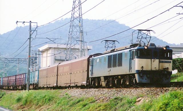 2003.06.06 伯備線貨物オフのメインターゲット・3084レ。豪渓〜総社にて撮影。 岡山県南部では真夏が近いと正面には光が回らず、冬季側半年強の間は暗くて撮影が困難な列車。 すでに正面は影にまわっているが、まだ少し光がまわりこんでいて少しは救われた。 手前の道路は交通量が少ないのだが、たまたま当日はちょうど列車がやって来たところに、 車が2台と散歩のおぢさんが^^; ひやひやものだったが、辛うじて回避できた(というかフレーミングで右に逃げていた)。