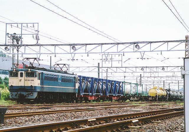 03/08/30 米原 3560レ。およそ1年振りの米原参り。 本日の3560レ、米原からはPF1001号機。阪神優勝記念?にてトップ画像へ。 台モノ4本、筒モノ10本と、まずまずにぎやかな編成。 ナンバーが青い状態で撮影できた1回限りの画像となってしまった。 編成全体を入れるには、右端に写り込んでいる信号箱が邪魔^^; 当日、同所にて同業者3名。