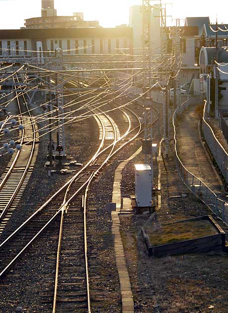 西日を受けて、レールと交換した枕木がギラリ。