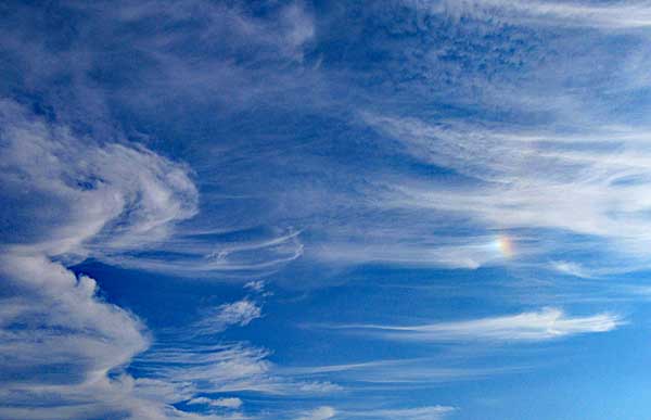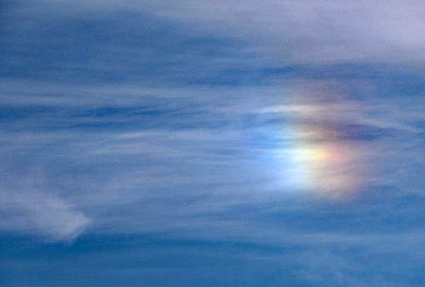白色のものも多いが、虹色に輝く場合は太陽に近いほうが赤となる。 |