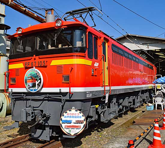| 4番線後方ではぴかぴかに再塗装されたEF67 105 で運転室を公開。 |