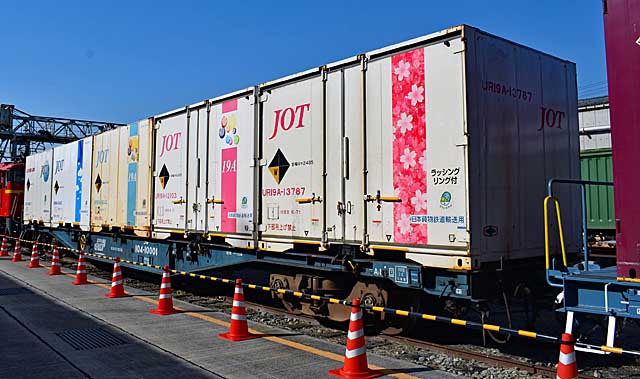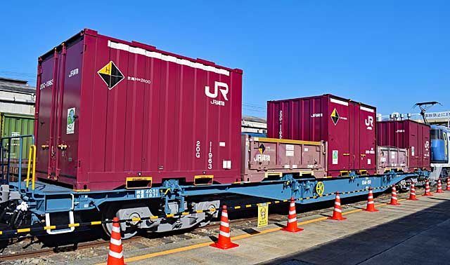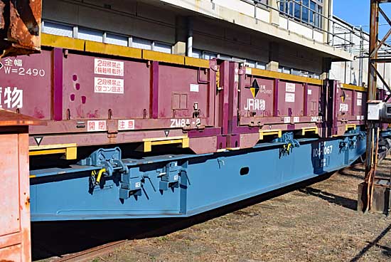 2番線総合事務所前で展示されていた コキ104-1067。 狭軌線路幅由来?